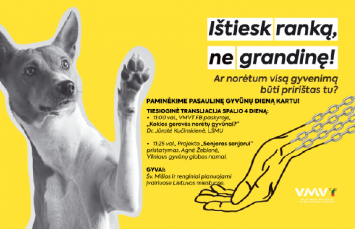 Švento Pranciškaus Asyžiečio arba Pasaulinės gyvūnų dienos proga, kuri švenčiama spalio 4 dieną, Valstybinė maisto ir veterinarijos tarnyba (VMVT) kviečia visus prisijungti prie jau tradicija tapusių pamaldų už gyvūnų gerovę bei kitų renginių visoje Lietuvoje. Šiemet VMVT visuomenei siunčia svarbią žinutę - „Ištiesk ranką, ne grandinę!“. Šiuo šūkiu gyvūnų gerovės specialistai tikisi atkreipti tos visuomenės dalies dėmesį, kuri gyvūną vis dar laiko “prie būdos rakinama signalizacija”, nejusliu daiktu. Toks vis dar gajus archajiškas požiūris dažnu atveju gyvūną gali pasmerkti kančioms ar net žūčiai.