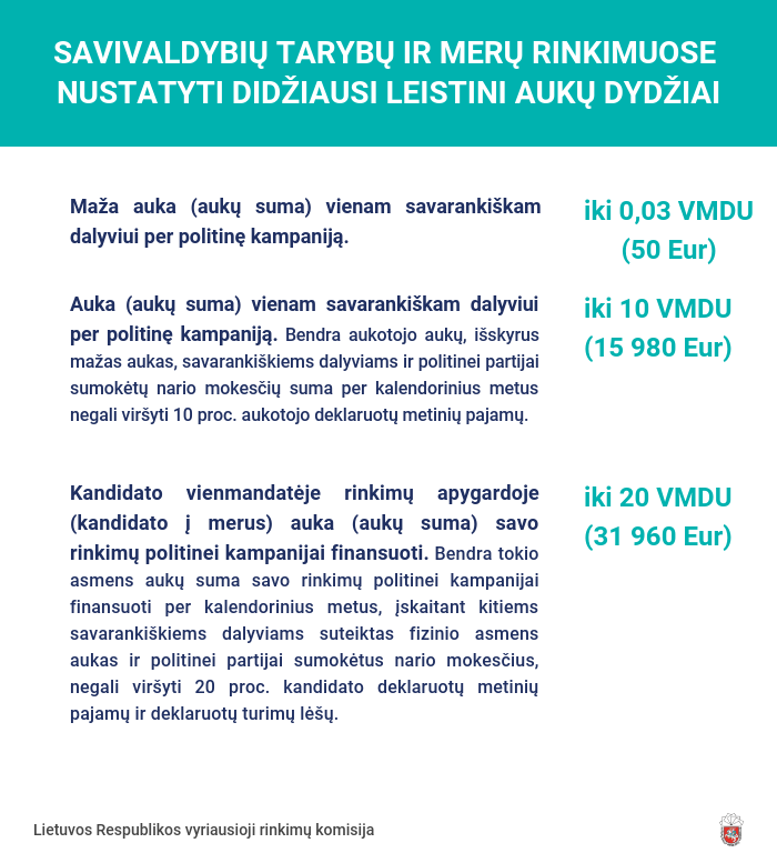 Vadovaujantis Rinkimų kodeksu, aukų dydžiai skaičiuojami vidutinio mėnesinio darbo užmokesčio (VMDU) dydžiais.