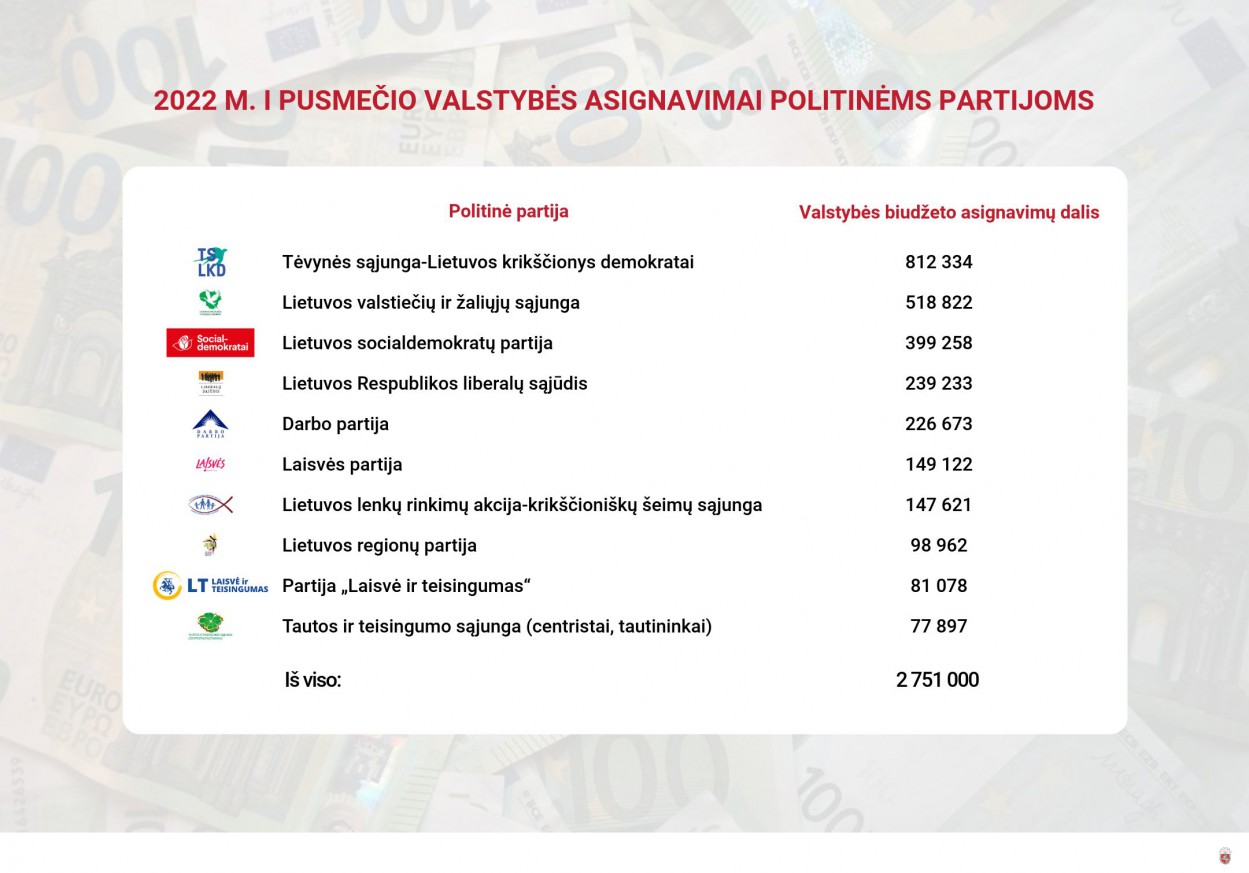 Balandžio 12 d. Vyriausioji rinkimų komisija (VRK) priėmė sprendimą dėl 2022 m. I pusmečio valstybės biudžeto asignavimų politinių partijų veiklai finansuoti dydžio nustatymo.