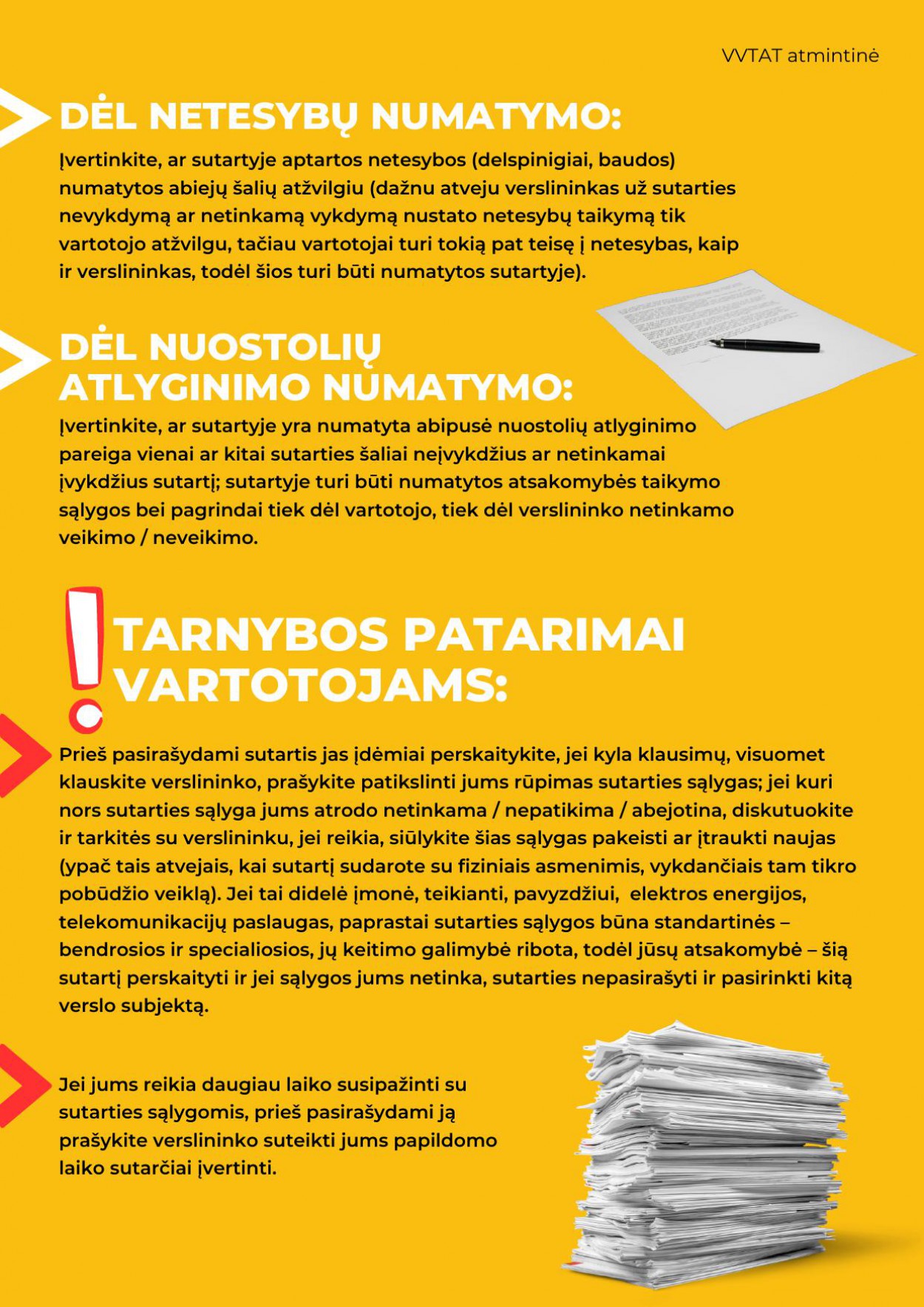 Valstybinei vartotojų teisių apsaugos tarnybai (VVTAT) nagrinėjant vartotojų prašymus išnagrinėti vartojimo ginčus ne teismo tvarka, atkreipiamas dėmesys, kokios yra vienos labiausiai pastebimos spragos prieš pasirašant sutartis:
