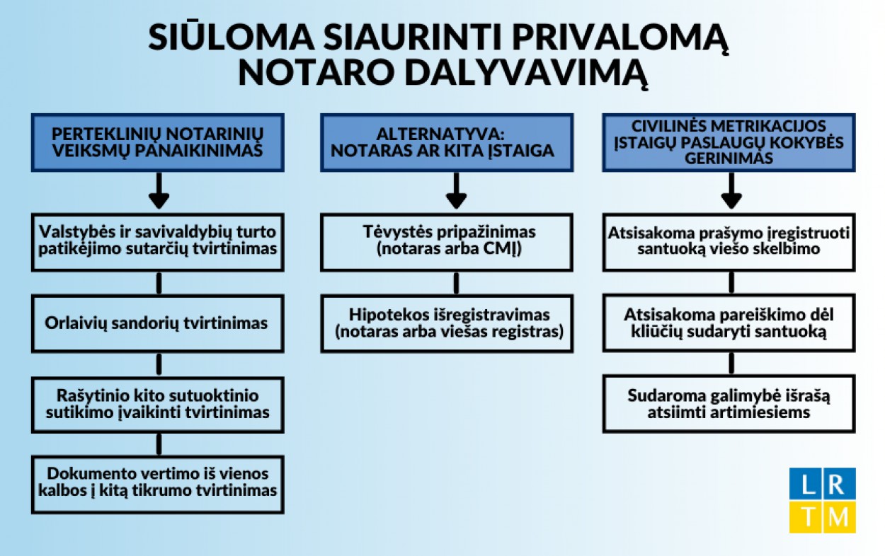 Teisingumo ministrės Evelinos Dobrovolskos teigimu, notaro vaidmuo užtikrinant sandorių teisėtumą visuomenėje yra labai svarbus, bet visuomenė, jos poreikiai ir lūkesčiai keičiasi, todėl labai svarbu atsisakyti notaro dalyvavimo ten, kur jo galima atsisakyti nesukuriant papildomų rizikų ir tokiu būdu sudaryti gyventojams bei institucijoms galimybes tam tikrus sandorius atlikti greičiau, o tam tikras paslaugas gauti ne tik kreipiantis į notarą.