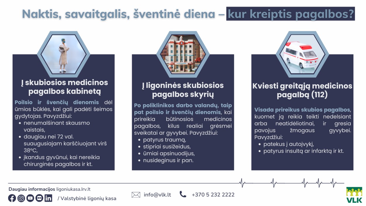 „Gydymo įstaigos savo pacientams turėtų suteikti aiškią informaciją, kur švenčių dienomis ir savaitgaliais galima kreiptis dėl sveikatos priežiūros paslaugų, pavyzdžiui, esant aukštai temperatūrai, stipriam skausmui ar nekontroliuojamam kraujospūdžiui. Svarbu, kad prie gydymo įstaigos prisirašę gyventojai šia informacija pasidomėtų iš anksto, tuomet prireikus pagalbos jiems nereikėtų gaišti laiko paieškoms ir patirti papildomų rūpesčių“, – sako Valstybinės ligonių kasos (VLK) Paslaugų kompensavimo skyriaus vyriausioji specialistė Diana Prochorova.