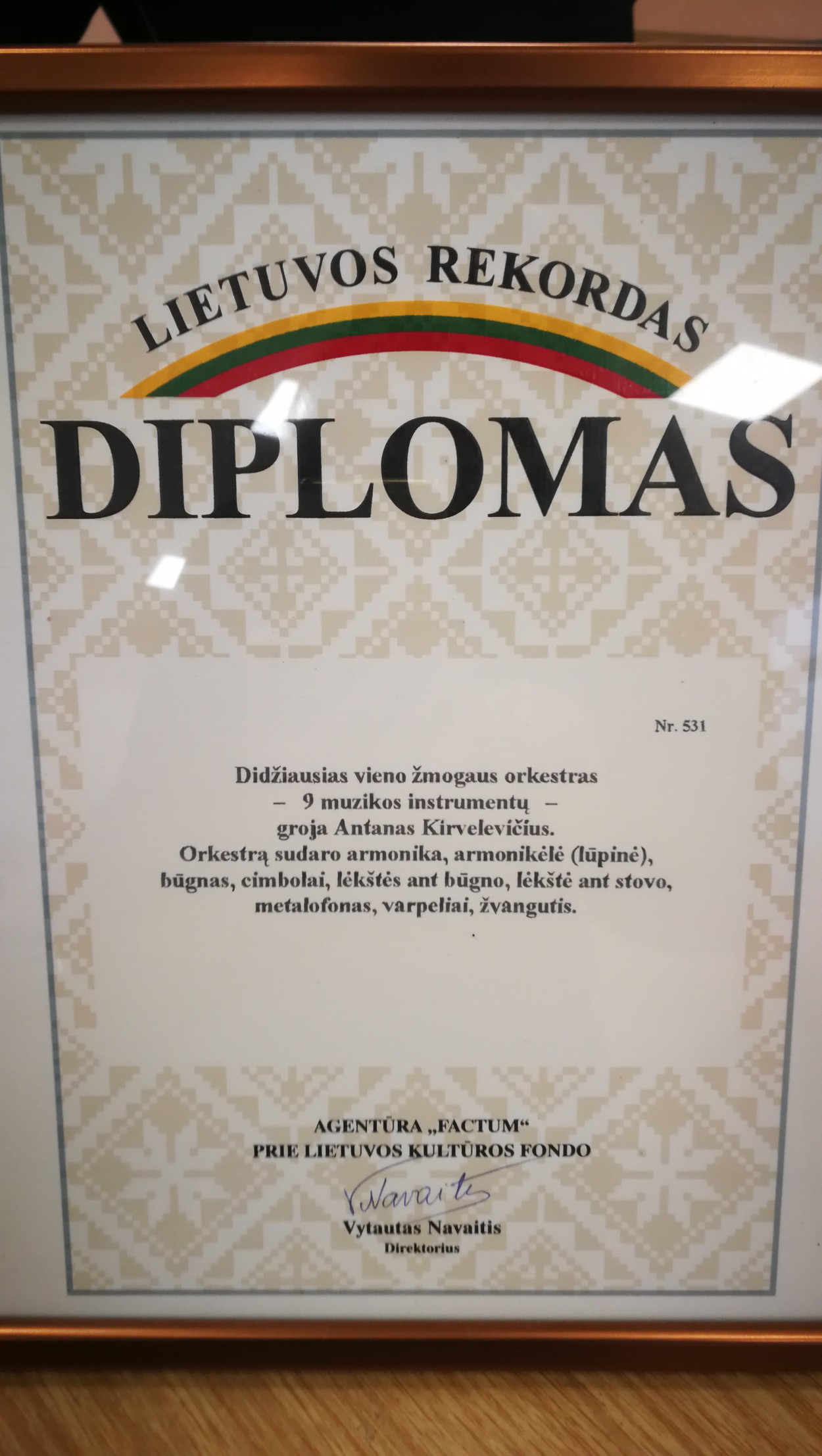 Žmogumi orkestru pramintas muzikantas Antanas Kirvelevičius, paskatintas televizijos laidos “Duokim garo”, vasario mėnesį pasiekė naują Lietuvos rekordą – penkias minutes grojo devyniais instrumentais: dviguba armonika, lūpine armonikėle, mušamuoju būgnu, lėkšte ant būgno, lėkšte “Čarlis”, cimbolais, varpeliais, žvangučiu, metalofonu. Apie šį rekordą byloja ir rekordus fiksuojančios agentūros „Factum“ diplomas.