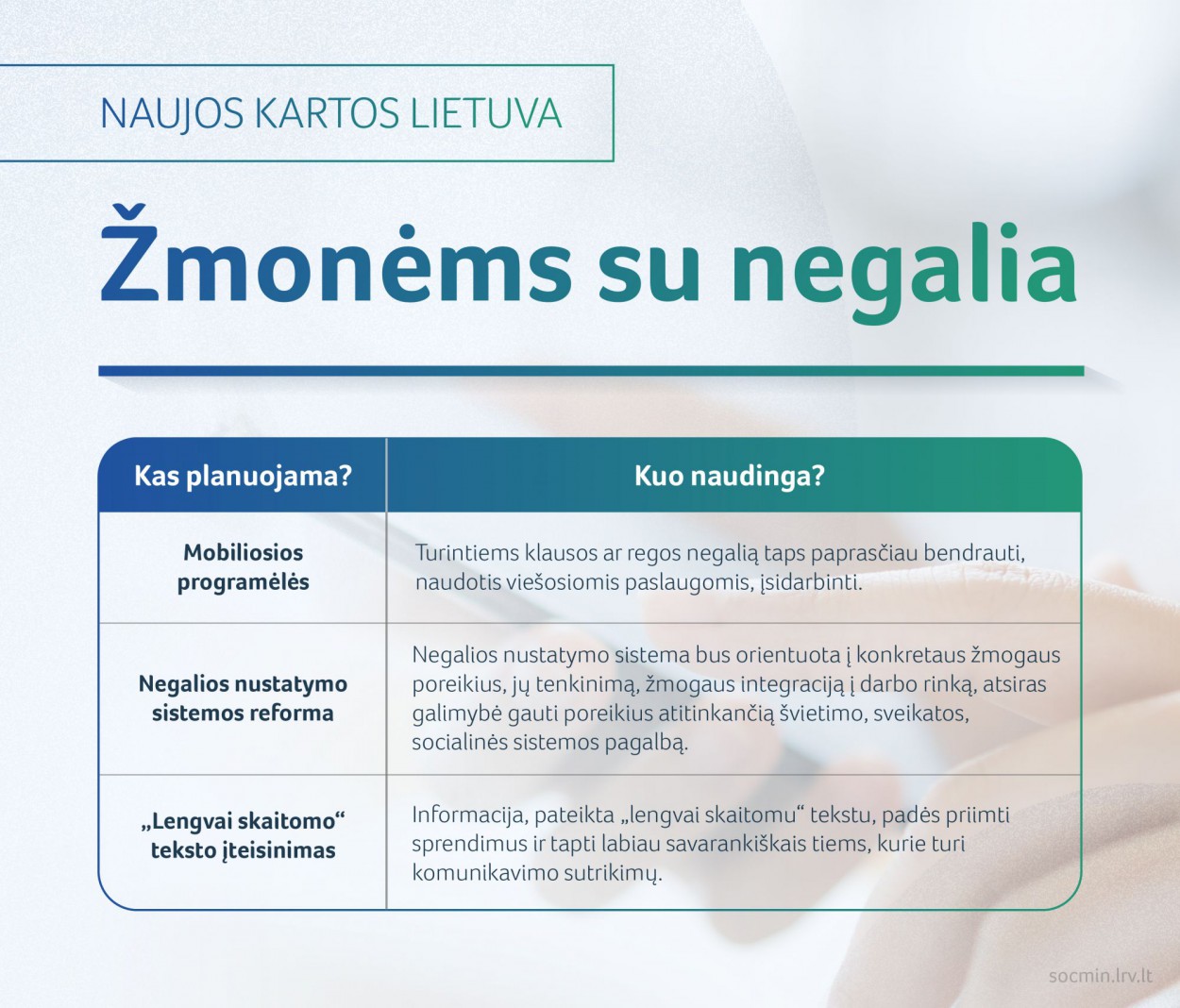 „Pokyčiai vyks tam, kad žmonės su negalia turėtų didesnes galimybes integruotis į atvirą darbo rinką, gauti jiems reikiamas socialines paslaugas bei priemones, kuriomis būtų pritaikoma tiek fizinė, tiek informacinė aplinka. Tikimės, kad netrukus prasidėsiantys kompleksiniai pokyčiai ženkliai padidins neįgaliųjų gyvenimo kokybę, o tuo pačiu sumažės jų diskriminacija visuomeniniame gyvenime“, – sako socialinės apsaugos ir darbo ministrė Monika Navickienė.
