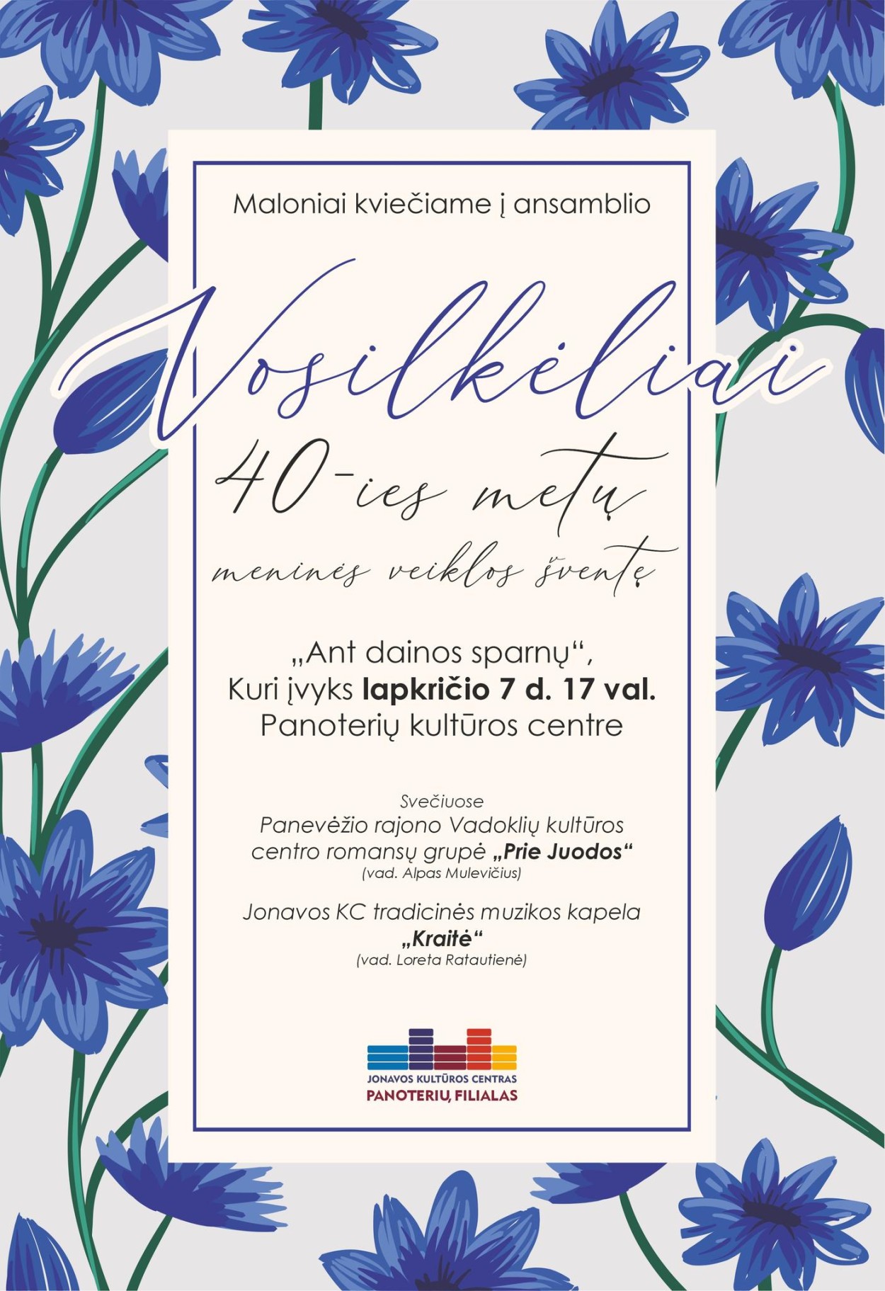 Panoterių kultūros centras kviečia į ansamblio ,,Vosilkėliai' 40-ies metų meninės veiklos šventę „Ant dainos sparnų", kuri įvyks lapkričio 7 d. 17 val. Panoterių kultūros centre.