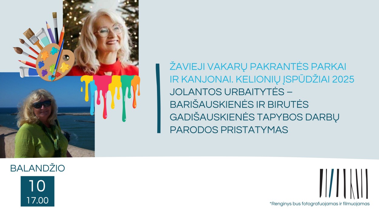 10 d. 17.00 B.Gadišauskienės ir J. Urbaitytės-Barišauskienės tapybos darbų parodos „Žavieji Vakarų pakrantės parkai ir kanjonai. Kelionių įspūdžiai 2025“ pristatymas | Skaitykla