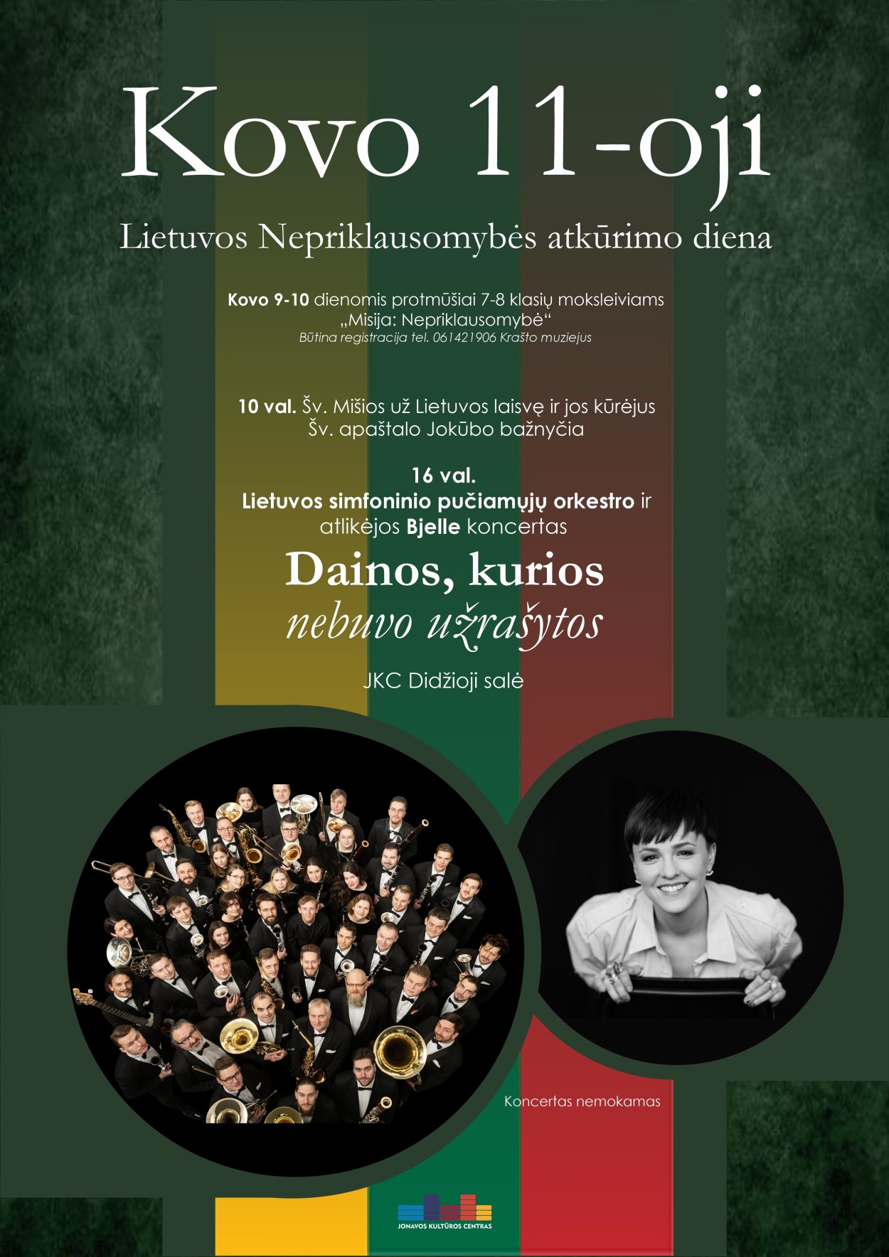 Kovo 11-oji - Lietuvos Nepriklausomybės atkūrimo diena.. 10 val. Šv. Mišios už Lietuvos laisvę Šv. apaštalo Jokūbo bažnyčioje. 16 val. Lietuvos simfoninio pučiamųjų orkestro ir Bjelle koncertas „Dainos, kurios nebuvo užrašytos“ JKC Didžiojoje salėje. Koncertas nemokamas.